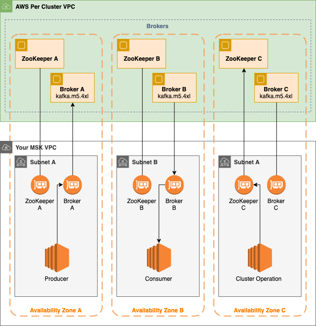 - Broker 노드— Amazon MSK 클러스터를 생성할 때 Amazon MSK가 각 가용 영역에 생성할 브로커 노드 수를 지정합니다. 이 다이어그램에 표시된 예제 클러스터에는 가용 영역당 하나의 브로커가 있습니다. 각 가용 영역에는 고유한 virtual private cloud(VPC) 서브넷이 있습니다.